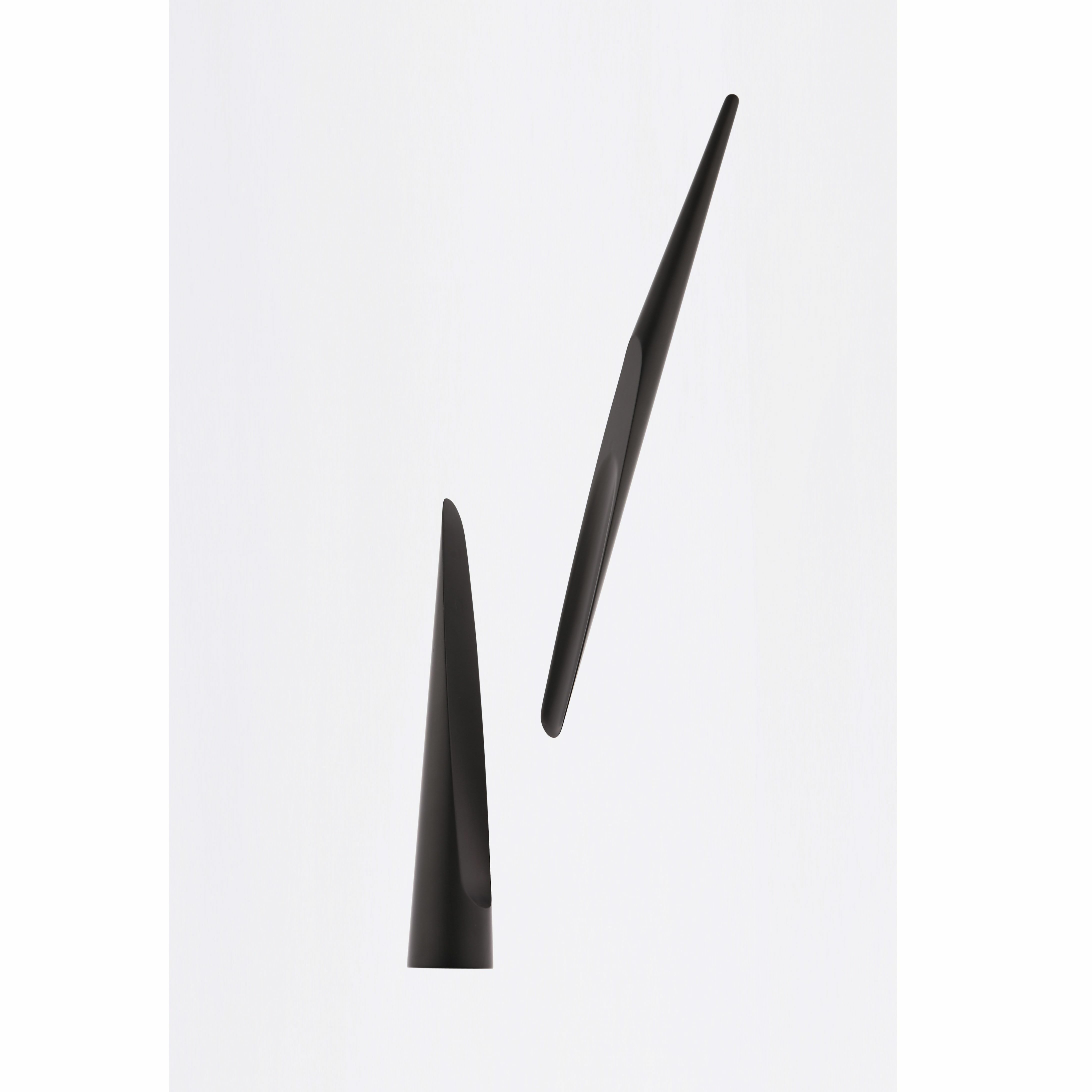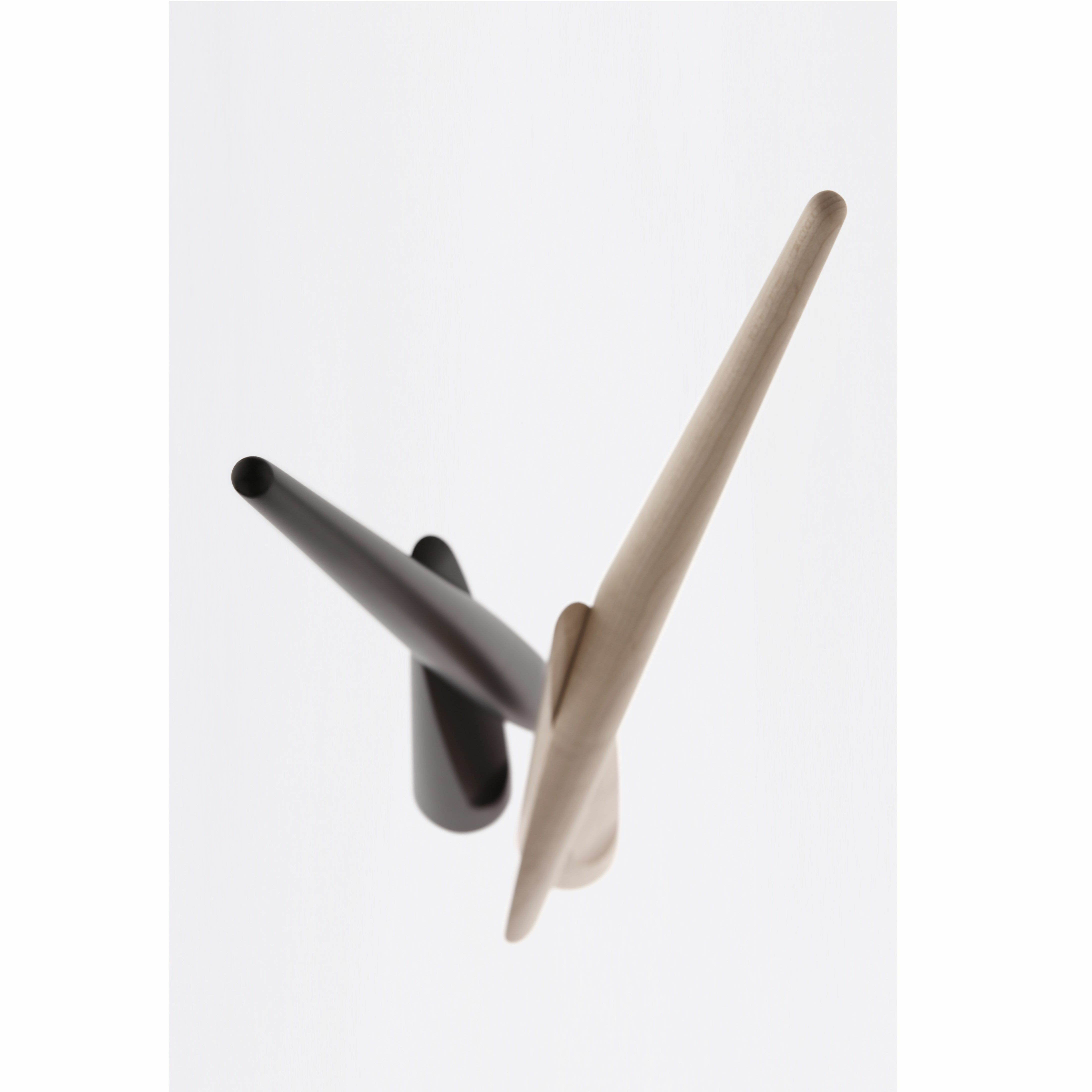 円錐の上部を持ち上げると、すぱっと斜めに割れてくつべらが現れます。動物の角(=horn)を削ってくつべらにしていたことが「shoe horn(=くつべら)」の語源ですが、同一の木材を削り出すことで、仕込まれたネオジウム磁石によって固定された「台座」と「くつべら」の継目部分の木目も限りなく揃い、まるで一本の角のようになりました。