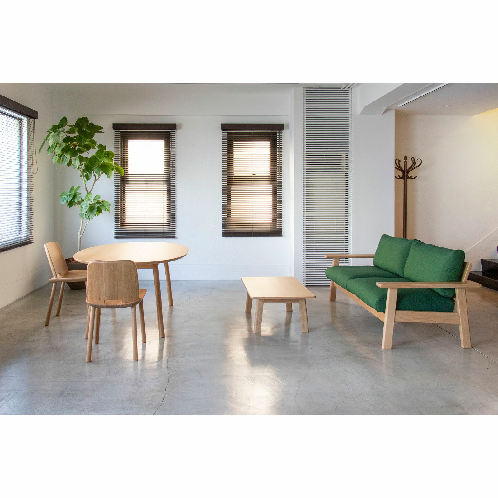 飽きのこないシンプルで端整な佇まいの木製テーブルです。 天板の角を丸く整え、ソファと同じハの字の型の脚を組み合わせています。自然と周りに調和するナチュラルな色合いが新鮮なテーブルです。