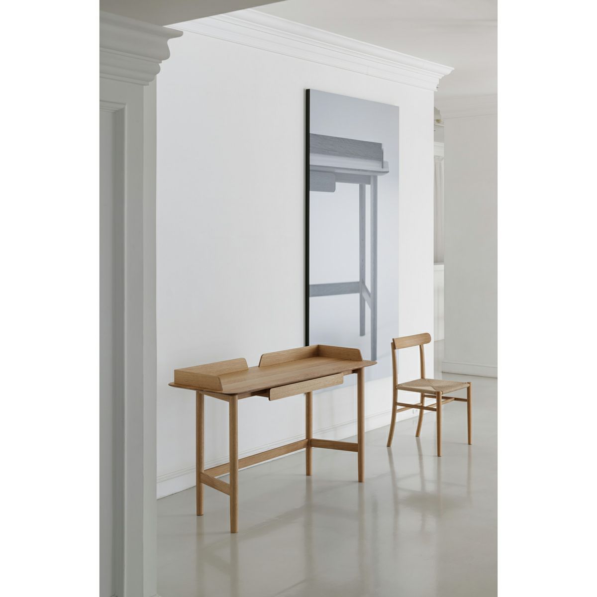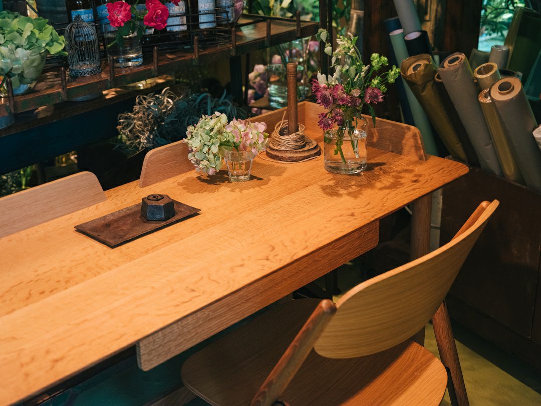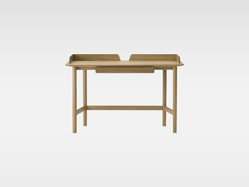 木材の温かみや風合いを感じられる無垢材のデスクです。 脚位置がハの字型になっていて、座わる側の脚間は広く、座らない側の脚間が少し狭いデザインで背面まで美しい佇まいが特徴です。 転び留めパネルや引出しがあるタイプと無いタイプからお選びいただけます。