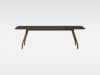 長方形のテーブルは、輪郭に沿ってお椀のような丸みをとったやわらかいシルエット。しなやかなカーブを描く木脚とあいまって、Takoアームチェアにも通じる清らかな静けさをまとっています。4本の脚をつなぐフレームは天板中央部に配置され、テーブル下の空間を広く使える構造です。