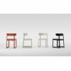 画像左から、マットダスティグリーン=淡いくすんだグリーンマットラスティレッド=さびのような濃い赤マットクレイホワイト=粘土の色にインスパイアされた限りなく白に近いトーンマットブラック=つやを抑えた墨のような深みを感じる黒ナチュラルクリア=メープル材のきめ細かな木肌を生かした塗装 の5種類よりお選びいただけます。