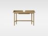 木材の温かみや風合いを感じられる無垢材のデスクです。 脚位置がハの字型になっていて、座わる側の脚間は広く、座らない側の脚間が少し狭いデザインで背面まで美しい佇まいが特徴です。 転び留めパネルや引出しがあるタイプと無いタイプからお選びいただけます。