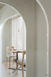 開放的な空間と、美しいアールデコ調の装飾が残る建物に、清潔でミニマルな内装とホワイトアッシュの建具がアクセントになっています。そこに黒の家椅子を合わせることで、洗練された空間に仕上がります。