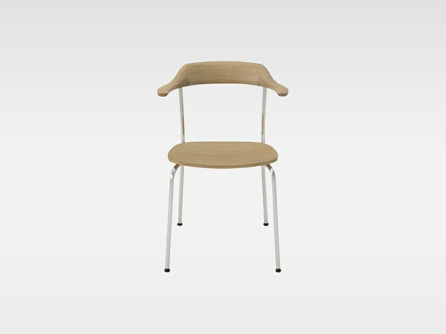 その完成されたフォルムは、チェアを積み重ねたり並べたり、複数脚集まった姿にも一体感が生まれるようにデザインされています。腕をそっと支えるアームは、圧迫感がなくチェアへの出入りがしやすいハーフアーム。継ぎ目を感じさせないなめらかな形状は、背中を包みこむようにカーブを描き斜めにもたれた姿勢も受け止めます。ホームユースだけでなく公共施設など多様な場面で活躍するアイテムです。
