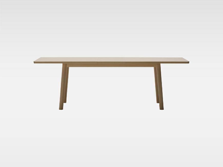 天板をスライドさせて追加天板を取り出し、サイズを幅180㎝から220㎝につぎ足しできる伸張式のテーブルです。縁をやや斜めにそぎ落した輪郭は、天板のフォルムを浮き立たせHIROSHIMAシリーズの他アイテムに通じる美しいシルエットをつくっています。