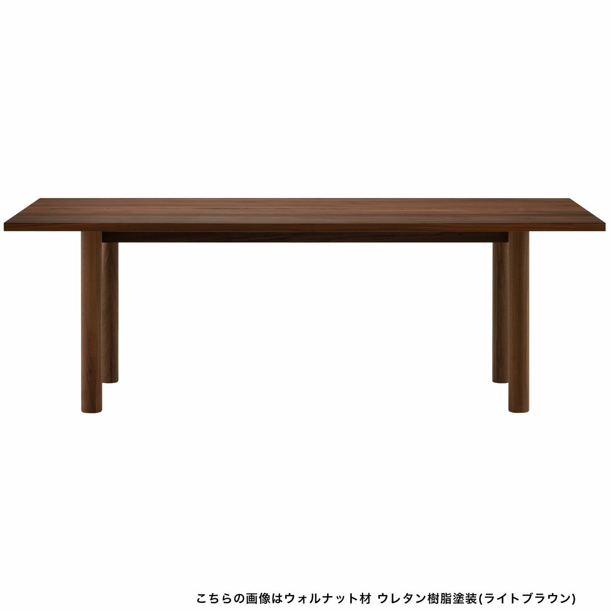木の温もりや力強さを感じられる無垢天板のテーブルです。厚み30mmの天板とやや太い円柱の組み合わせ。シンプルなパーツで構成された安定感のあるフォルムは、そのバランスに工夫をこらして設計されています。どの椅子を合わせても調和がとれ、美しい空間をつくります。 天板は、無垢の板材を横方向にはぎ合わせています。同様の部位を繰り返して使わず、色や柄の違いをうまく組み合わせ、2つとして同じものがないように仕上げています。木のもつ豊かな表情と、使い込むほどに生まれる味わいをお楽しみください。 長手方向の幕板は天板中央部に配置されているため、テーブル下に十分なスペースがあります。ひじ掛けがついたHIROSHIMAアームチェアも、テーブル下におさめることができます。 掲載以外のサイズをご希望の方は、「ショップスタッフにお問合せ」よりお問い合せください。