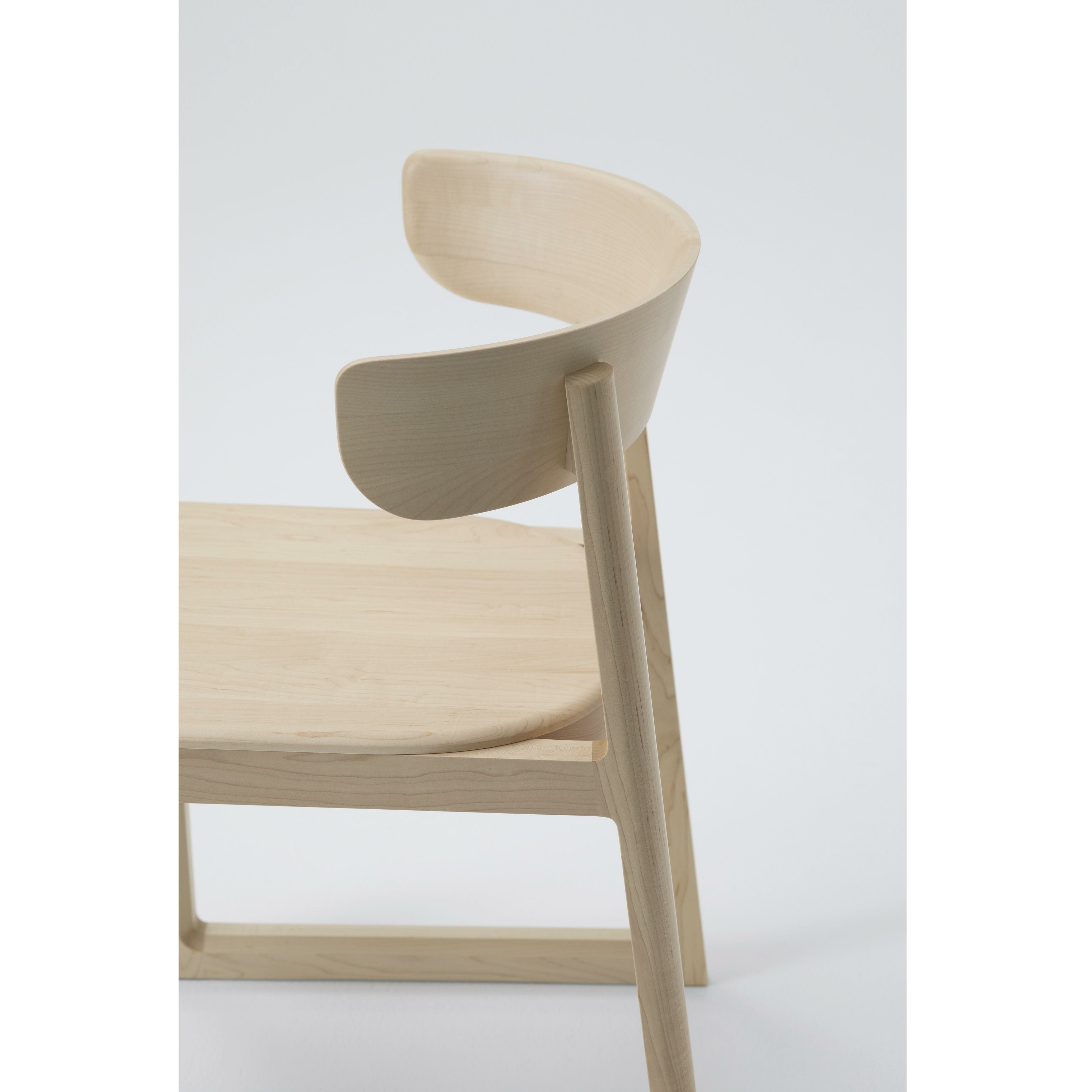 丸い天板やのびやかなカーブを描いた背もたれと、シンプルなループフレームの対比が美しいシリーズです。三次曲面に削り出された背もたれは背中を優しく包みこみ、印象的でありながら大らかな静けさをまとっています。