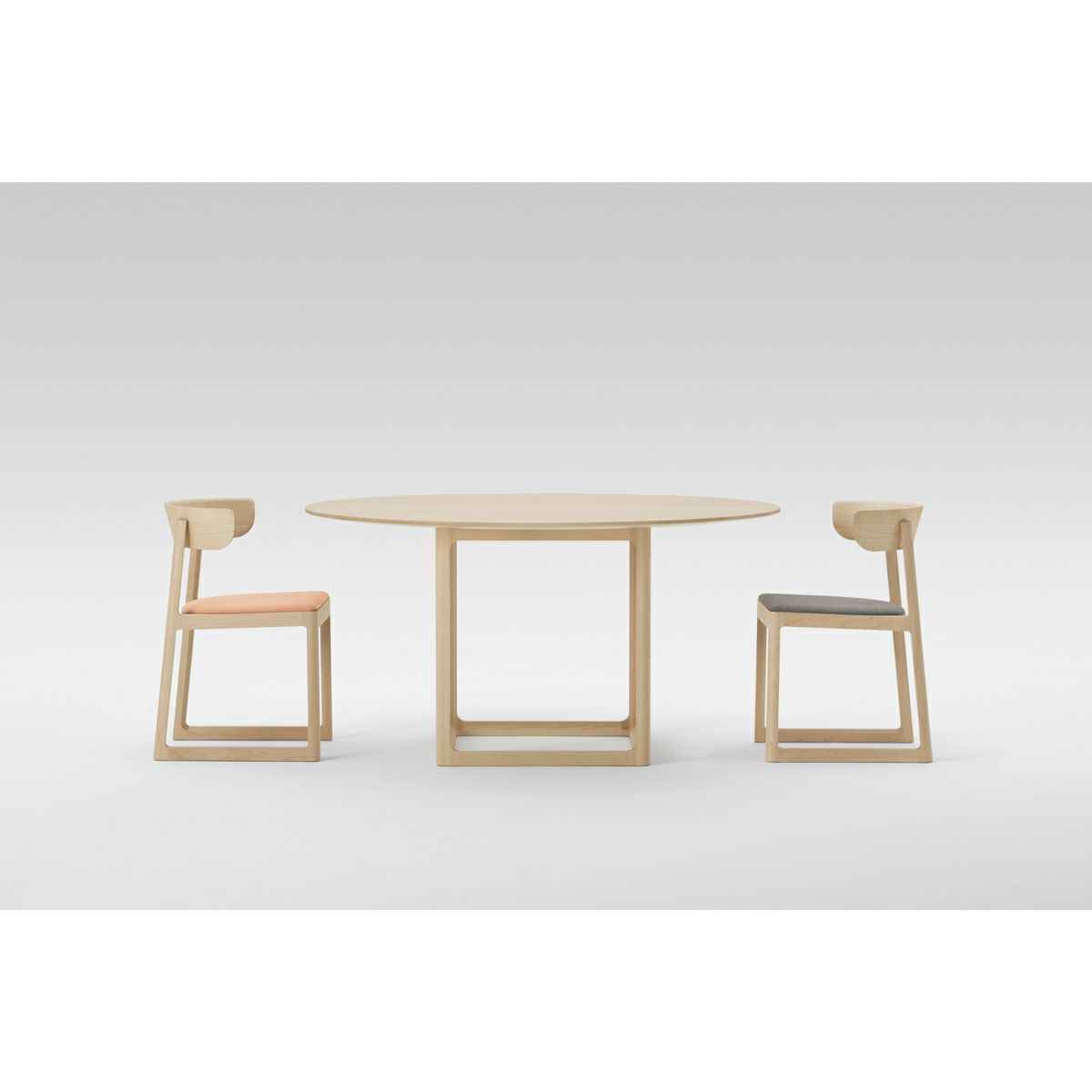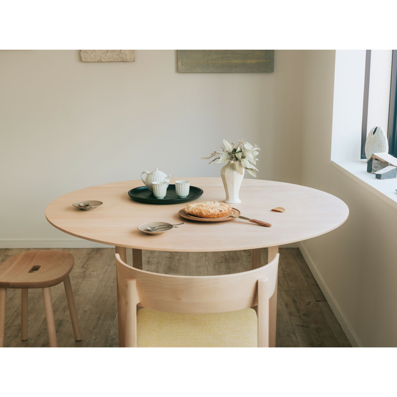 丸い天板やのびやかなカーブを描いた背もたれと、シンプルなループフレームの対比が美しいシリーズです。