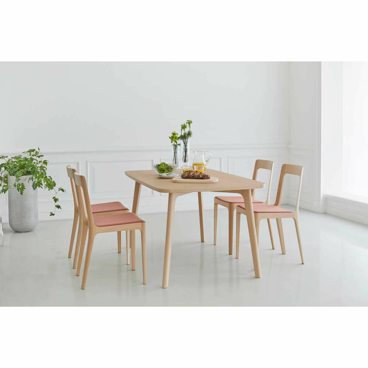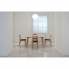 縁をやや斜めにそぎ落した輪郭は、天板のフォルムを浮き立たせHIROSHIMAシリーズの他アイテムに通じる美しいシルエットをつくっています。天板と4本の脚でつくられたシンプルな構造で、テーブル下の空間を広く使えることも魅力の一つ。ひじ掛けがついたHIROSHIMAアームチェアもテーブル下におさめることができます。