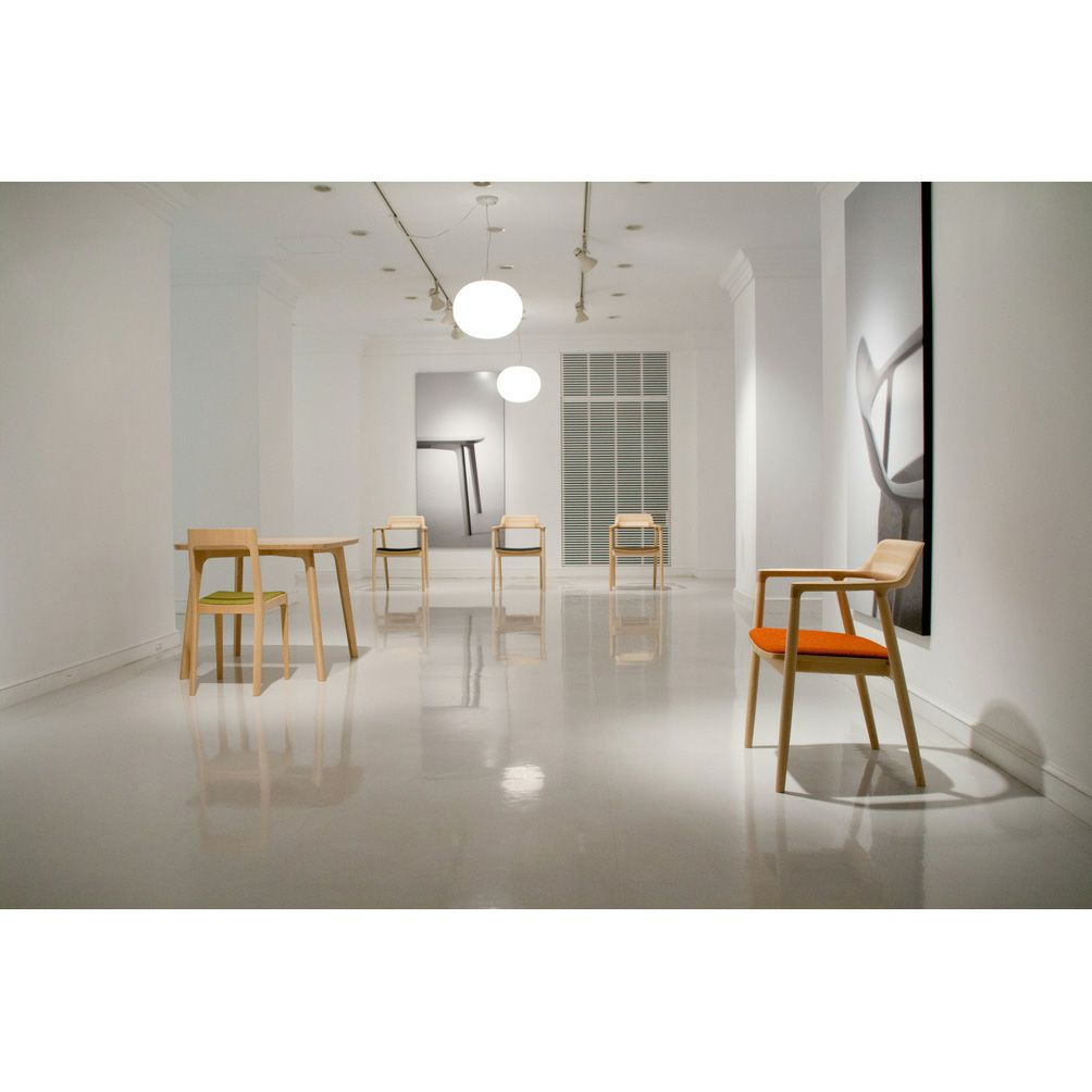 縁をやや斜めにそぎ落した輪郭は、天板のフォルムを浮き立たせHIROSHIMAシリーズの他アイテムに通じる美しいシルエットをつくっています。天板と4本の脚でつくられたシンプルな構造で、テーブル下の空間を広く使えることも魅力の一つ。ひじ掛けがついたHIROSHIMAアームチェアもテーブル下におさめることができます。