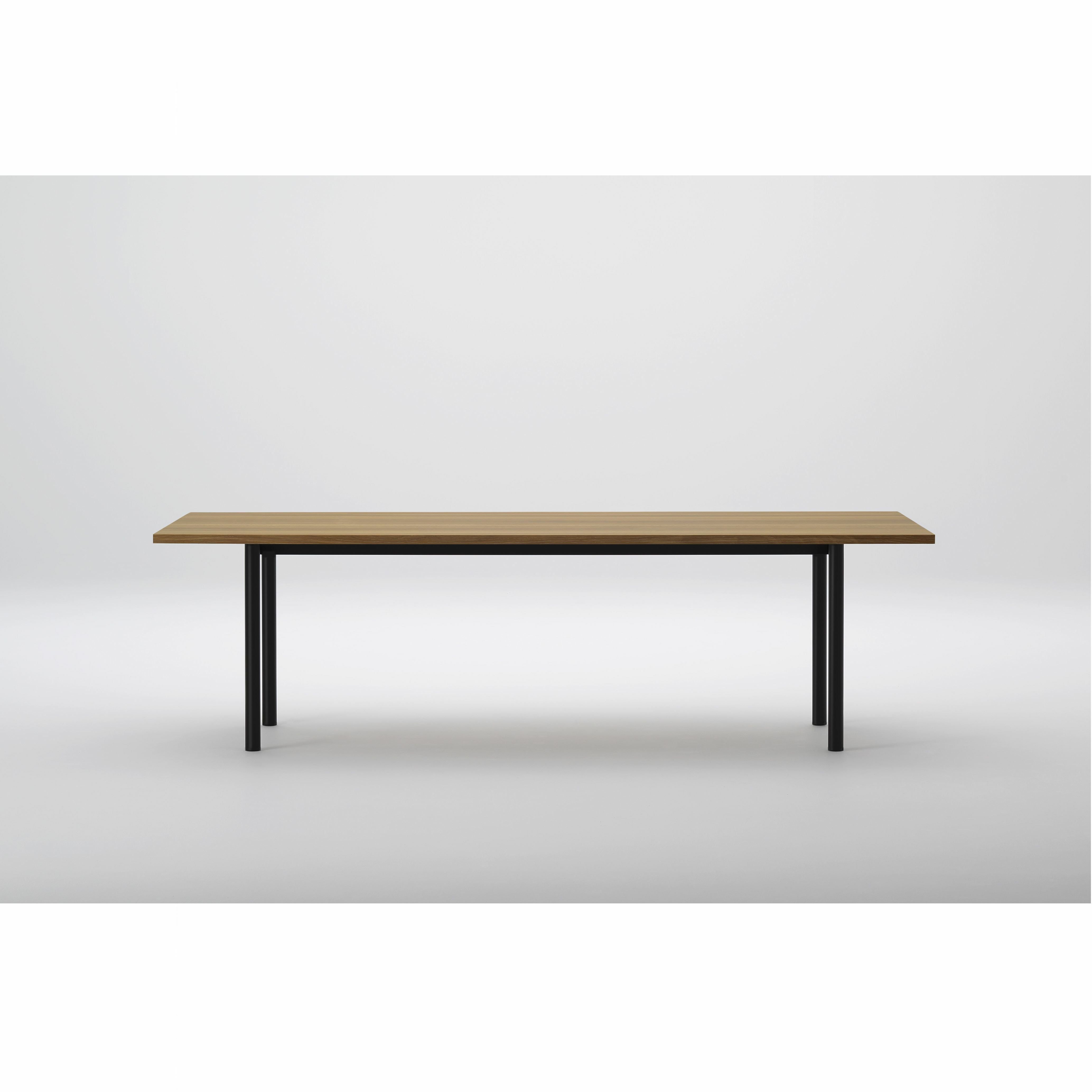厚み30mmの天板を支えるスチール製の脚組は、艶をおさえたマットブラック色。木とスチール、対比された2つの異素材がそれぞれの美しさを引き立てています。 シンプルなパーツで構成された安定感のあるフォルムは、そのバランスに工夫をこらして 設計されています。どの椅子を合わせても調和がとれ、美しい空間をつくります。