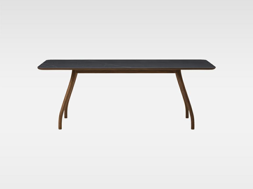 長方形のテーブルは、輪郭に沿ってお椀のような丸みをとったやわらかいシルエット。しなやかなカーブを描く木脚とあいまって、Takoアームチェアにも通じる清らかな静けさをまとっています。4本の脚をつなぐフレームは天板中央部に配置され、テーブル下の空間を広く使える構造です。
