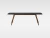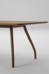 長方形のテーブルは、輪郭に沿ってお椀のような丸みをとったやわらかいシルエット。しなやかなカーブを描く木脚とあいまって、Takoアームチェアにも通じる清らかな静けさをまとっています。4本の脚をつなぐフレームは天板中央部に配置され、テーブル下の空間を広く使える構造です。