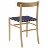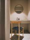 6色から選べる「ウェビングシート」には、わずかに艶のあるナイロン糸を織り合わせたテープを使用しています。強固な素材を一定の張をもたせながら編みこんだ座面は、身体の重みでわずかに沈み込む底あたりのない座り心地です。直交し合うテープの端正な表情は、木のやわらかい質感を引き締め、空間にほどよい緊張感をもたらします。
