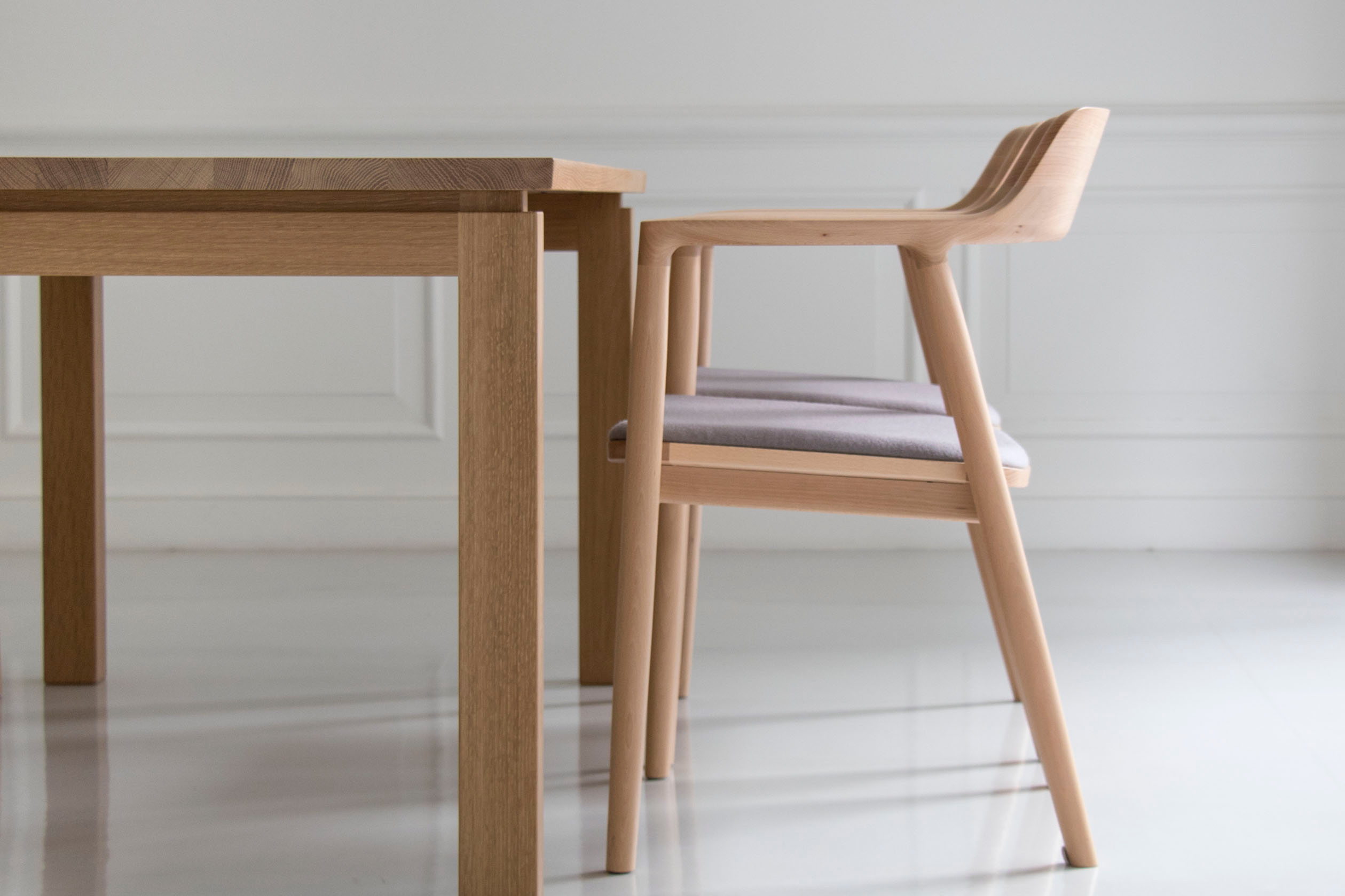 天板と脚の間に空間を持たせることで、厚みのある30mmの無垢集成材天板が軽やかに浮かび上がり、量感のある素材感と軽快な印象を同時に楽しめます。
