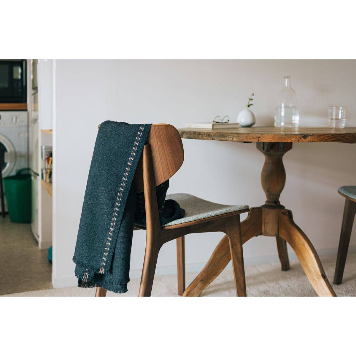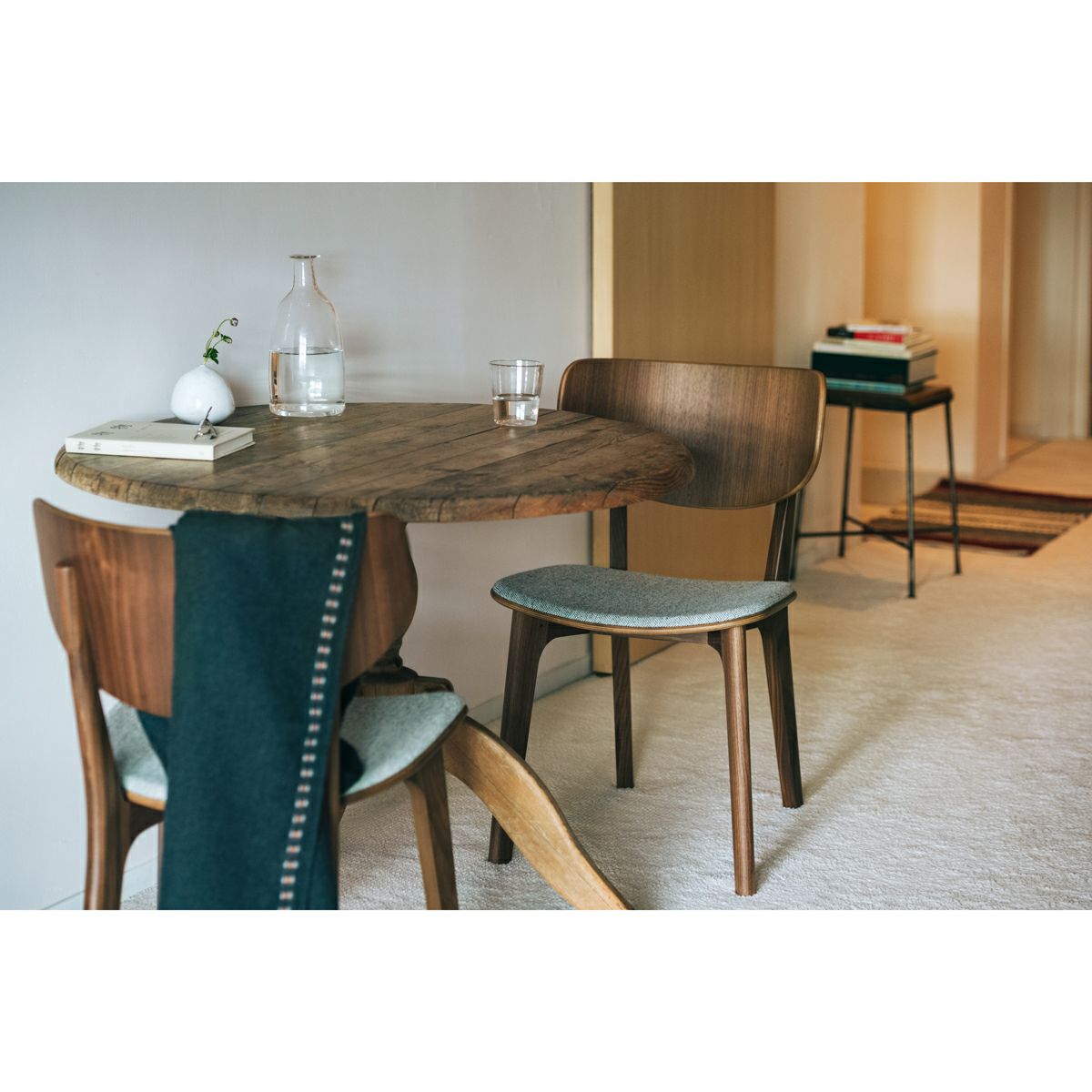 どこに触れても丸みの感じられるやわらかいフォルム。背板の曲がりと座板の輪郭は呼応するようにそろえられ、後ろから見た姿が特に美しい造形です。