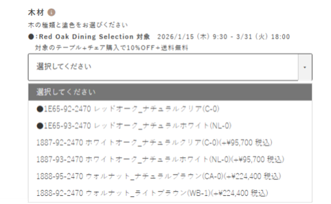 商品詳細ページ内の「木材」選択欄にて、先頭に●が付いたレッドオークの選択肢が対象となります。